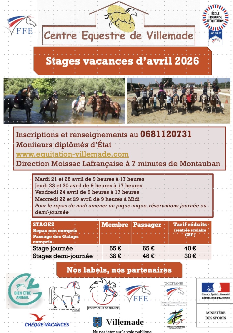 Le CENTRE ÉQUESTRE de VILLEMADE est situé au cœur du Tarn-et-Garonne à 8 minutes de MONTAUBAN, proche de LAFRANCAISE, MEAUZAC, LAVILLEDIEU, MOISSAC , et CASTELSARRASIN.Implanté depuis 2002 dans le village de VILLEMADE entre le Tarn et l'Aveyron, dans un havre de verdure permettant la pratique de l'équitation pour les petits et les grands.